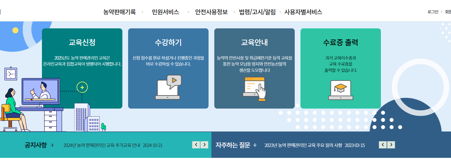 농약 판매관리인 교육시스템은 농약을 판매하는 모든 판매관리인이 반드시 이수해야 하는 법정 교육을 제공하는 온라인 및 오프라인 통합 플랫폼입니다. 농약의 안전사용 기준, 취급제한 사항, 관련 법규 등을 체계적으로 학습할 수 있도록 설계되어 있습니다. 교육 미이수 시 과태료가 부과되므로, 농약 판매업 종사자라면 반드시 정해진 기간 내에 교육을 이수해야 합니다.